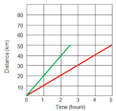 Which sketch (red or green) on the distance-time graph represents a faster velocity?