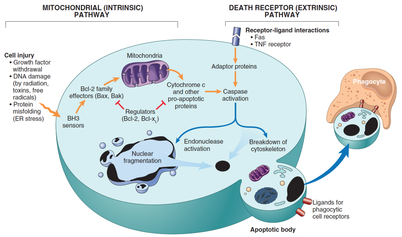 • Cell injury -> BH3 receptors -> Bcl2 effectors (Bak-Bak, Bax-Bax channels) -> Cytochrome C leaks out -> Pro-caspase -> Caspase -> activation of effector caspase 3,6,7.