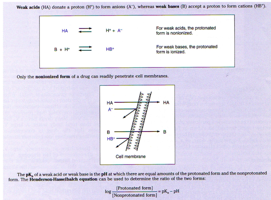 -recall: such chemicals exist in both ionized and nonionized forms in solution, and the relative proportion of ionized vs nonionized form depends on the pKa of the xenobiotic and the pH of the solution