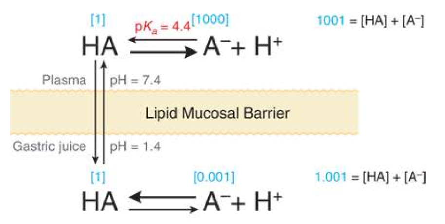 what is the passive diffusion of a weak acid (pKa=4.4) from stomach (pH=1.4) to bloodstream (pH=7.4)?