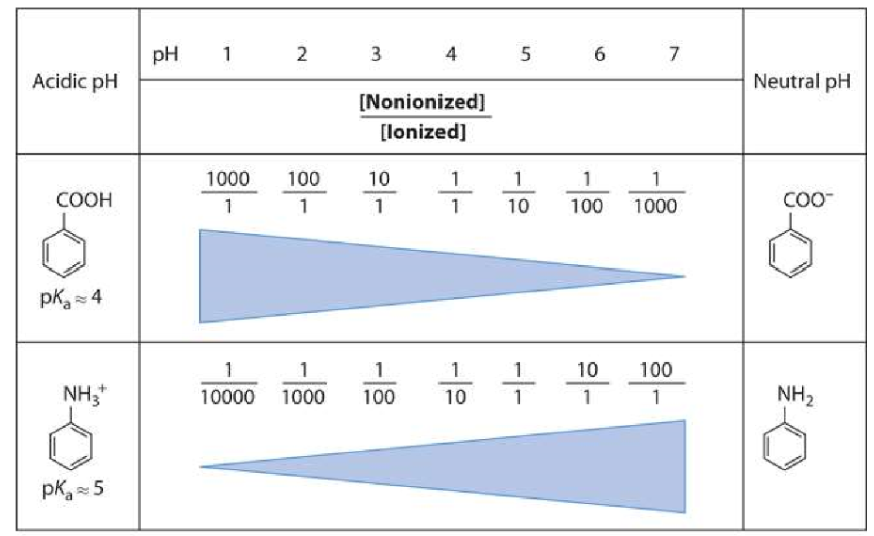 what is the effect of pH on the ionization of benzioc acid (pKa=4 acid) and aniline (pKa=5 base)?