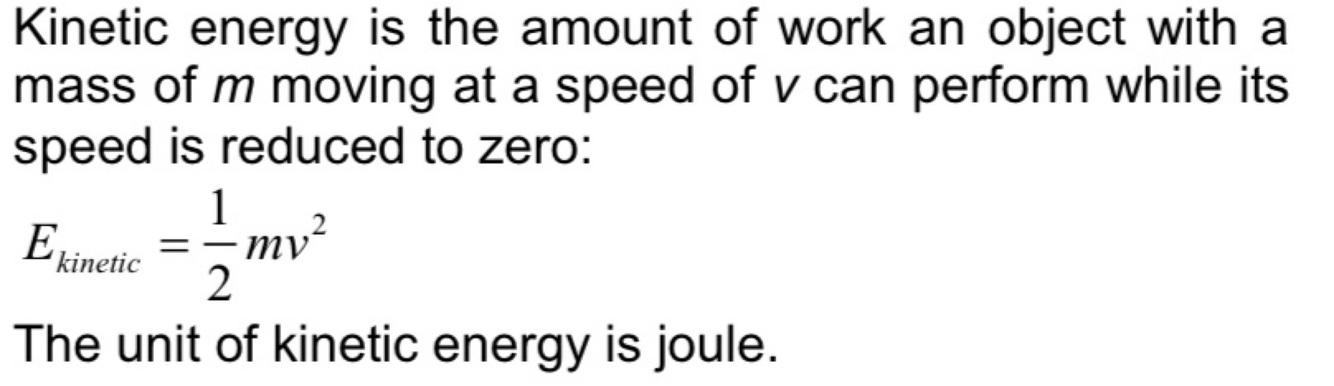 Define kinetic energy in words and with a formula, and give its unit.