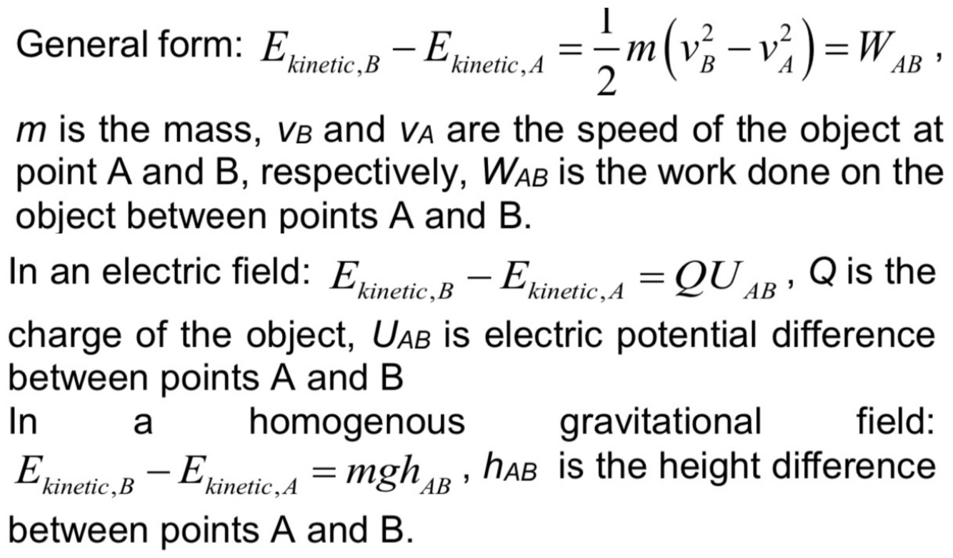 Formulate the general form of the work-energy theorem, and its special form for the electric and homogenous gravitational fields.