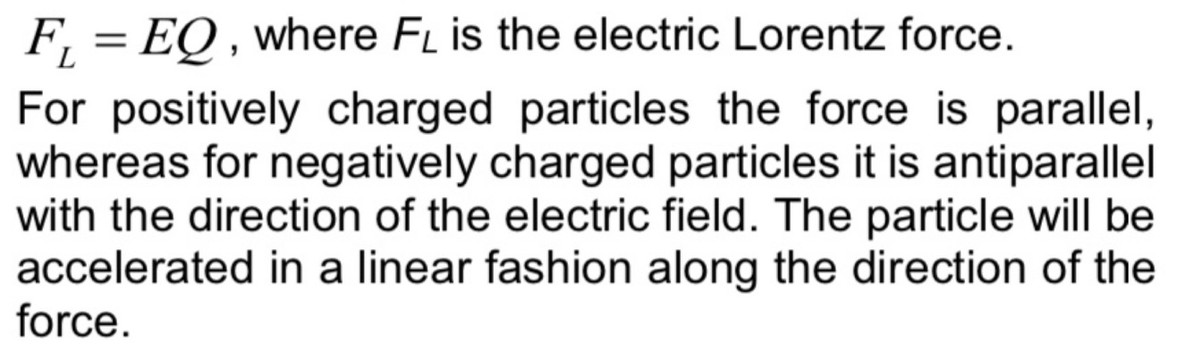 Give the magnitude and direction of the electric Lorentz force acting on a particle of charge, Q in an electric field, E. What is the consequence of the force on the charged particle?