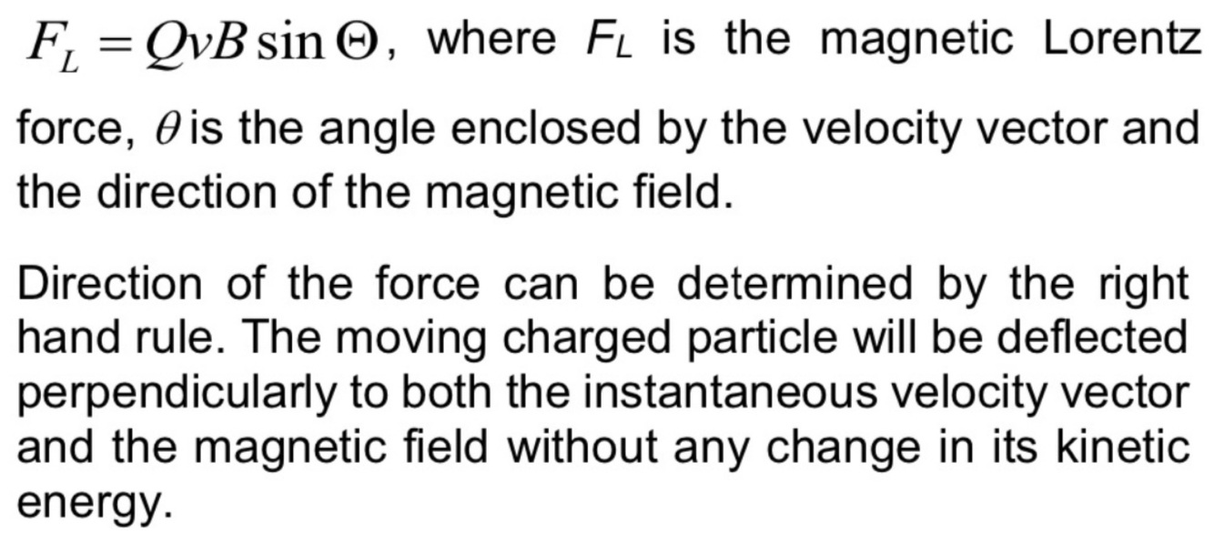 Give the magnitude of the magnetic Lorentz force acting on a particle of charge, Q which moves at a speed v in a magnetic field, B. What rule should be applied to obtain the direction of the force? What is the consequence of this force on the charged particle?