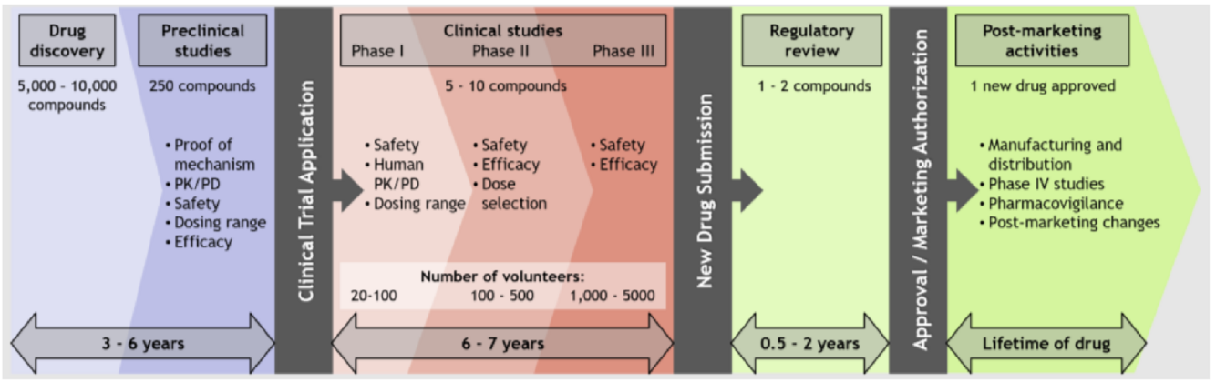 -phase I (<50 patients): is it safe? healthy volunteers (dont actually have the disease. want to establish baseline and side effects)