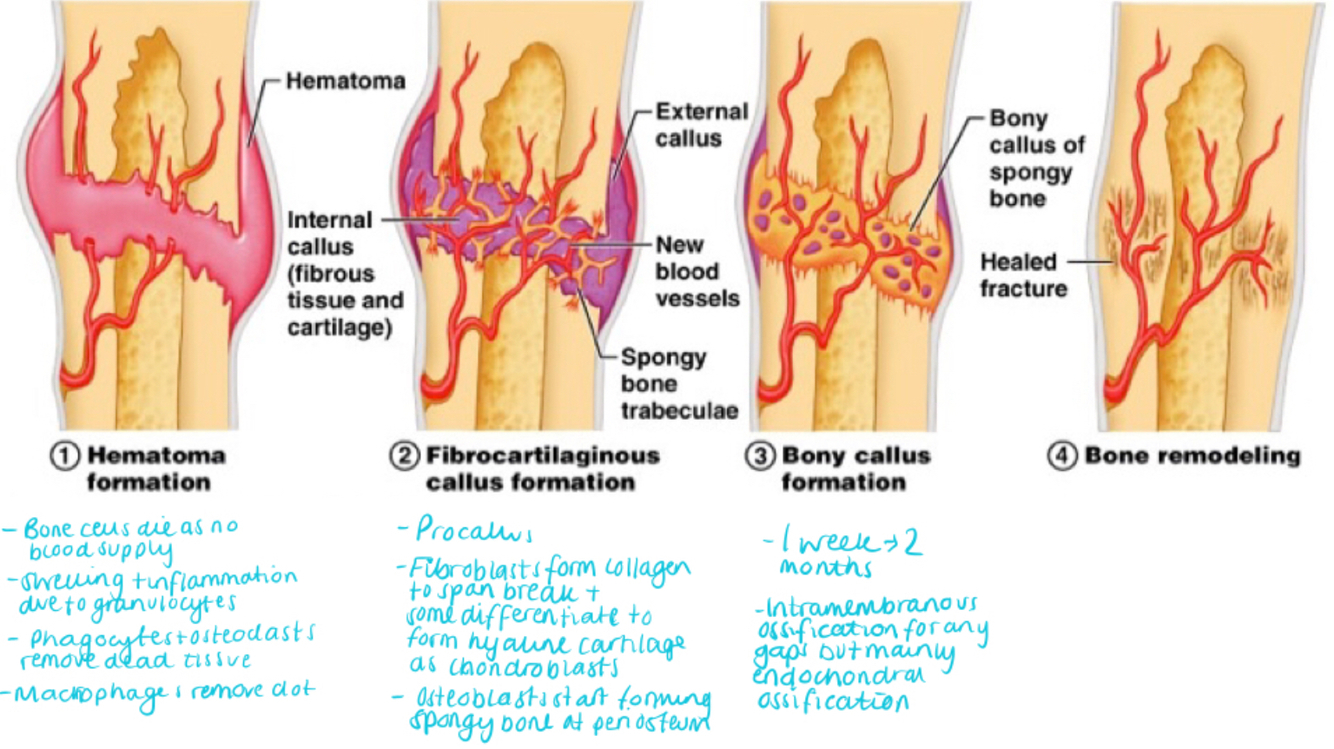 3. Bony Callus (lasts 2-3 weeks) = endochondral ossification forms spongy bone. Can see callus on X-ray 2-3 weeks after injury