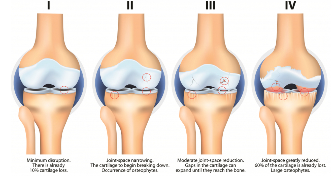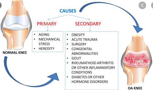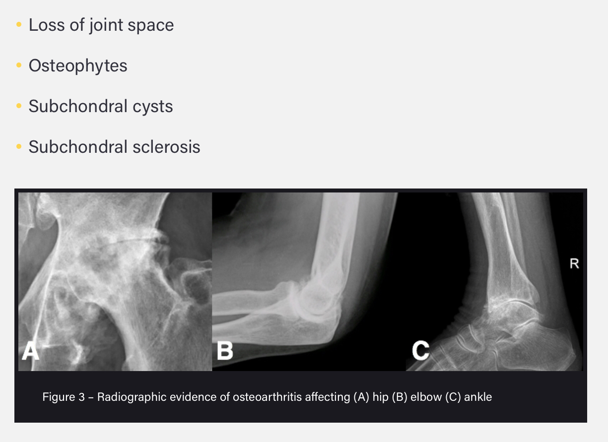 Chondrocytes in articular cartilage release enzymes to break down collagen and proteoglycans destroying cartilage. Exposure of subchondral bone results in sclerosis and remodelling which causes osteophtes and subchondral bone cysts. Joint space is lost over time