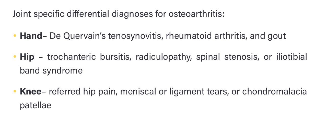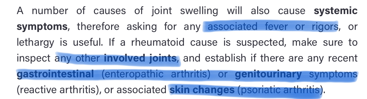 Always consider RA, gout, septic arthritis, fractures, bursitis and malignancy (primary and metastatic)