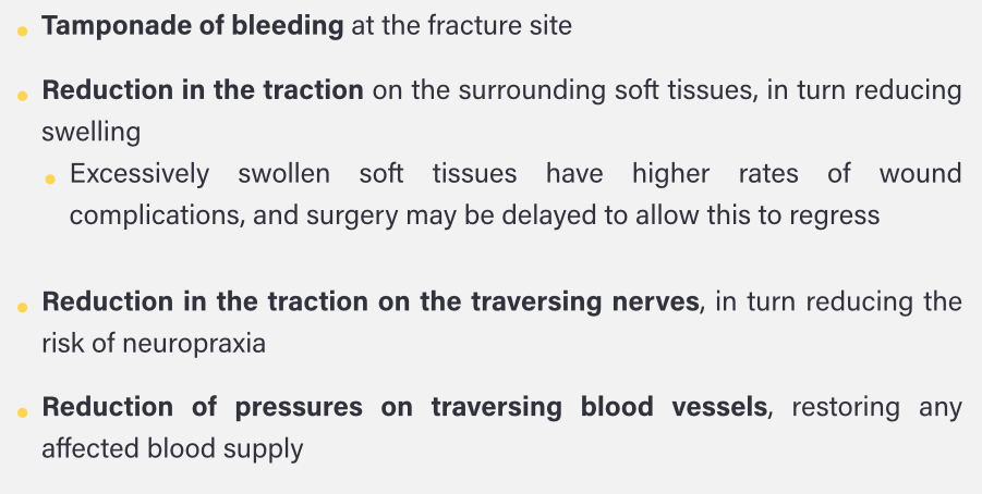 - Consider if traction needed (when muscle pull strong across fracture site so unstable e.g subtrochanteric NOF, demoral shaft fractures)