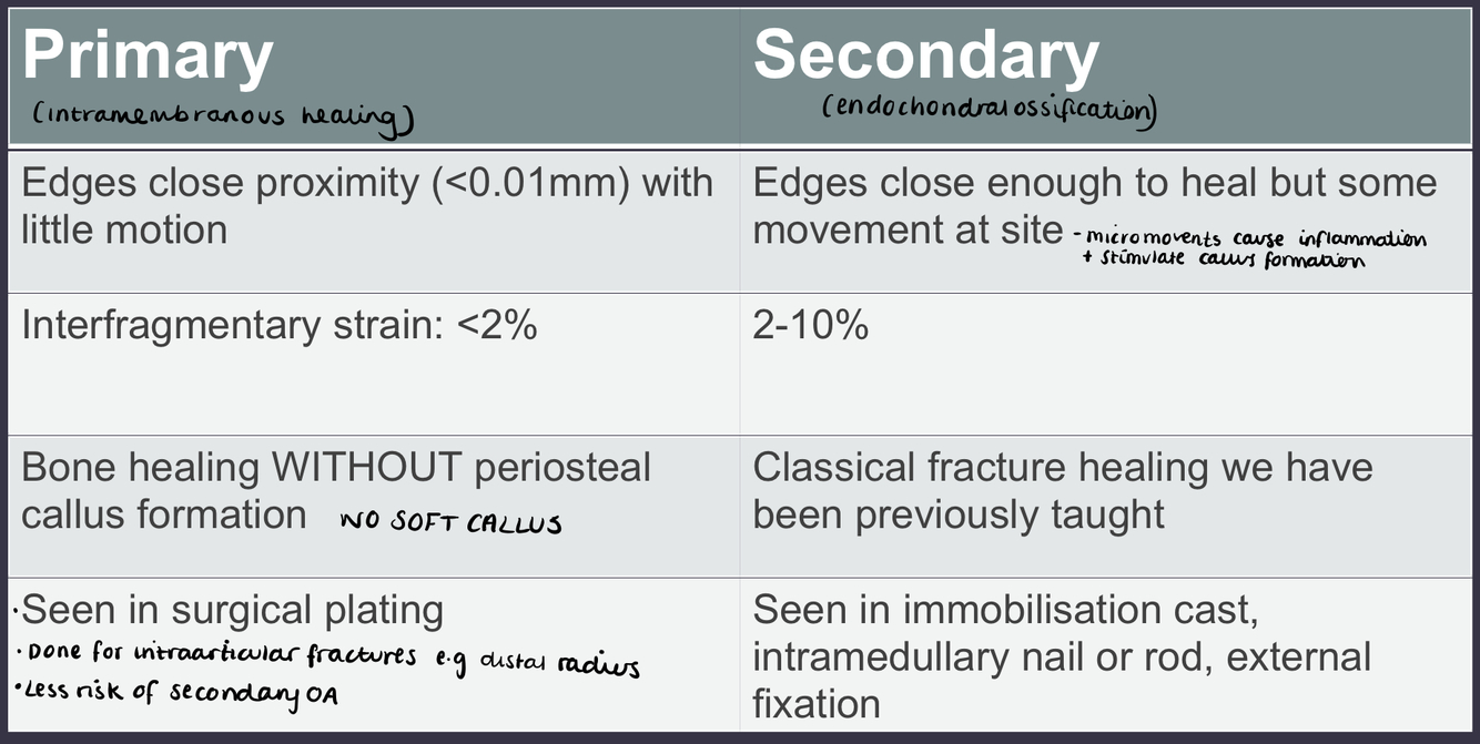 Intramedullary nail: does not cause full rigidity so still alows some movement at fracture site. Reaming causes disruption to blood supply in inner 2/3rds of diaphysis but doesn’t stop external callus formation. Secondary bone healing
