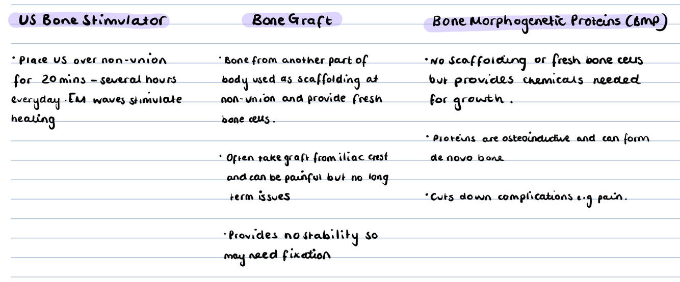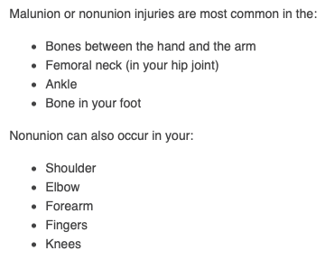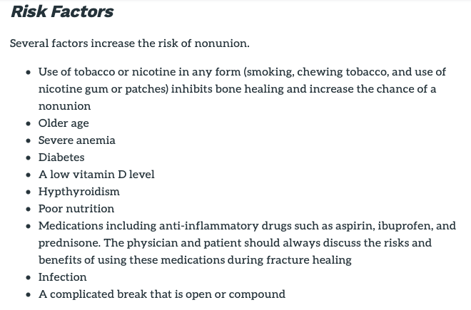 Non-union: poor blood supply or bone instability (tobacco use, DM, obesity)