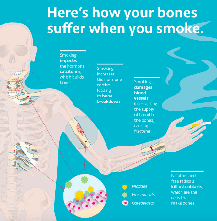 Nicotine can slow fracture healing by killing osteoblasts and lowering estrogen effectiveness