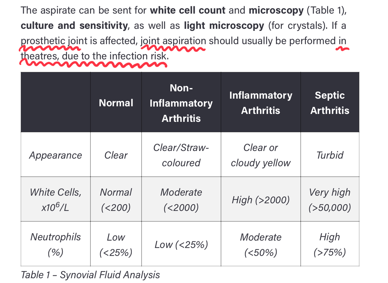- Joint Aspiration (look at opacity, colour and presence of frank pus then sent for WCC and microscopy)