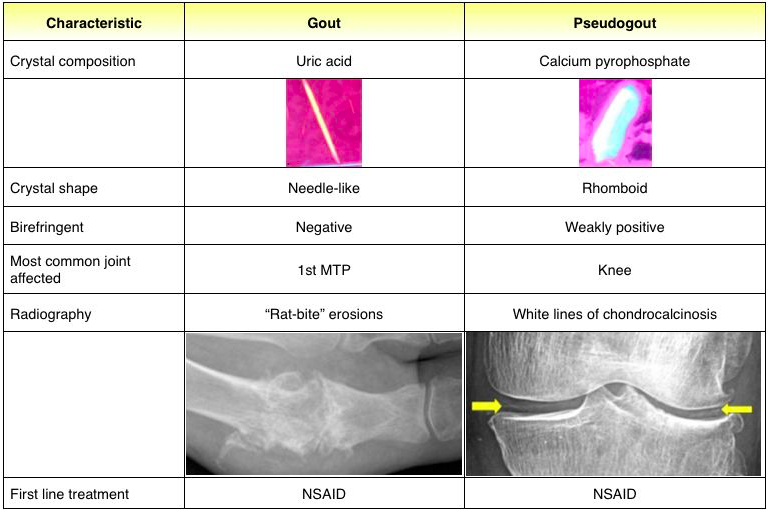 Gout and Pseudogout can cause an acutely swollen joint. What are they and how are they managed?