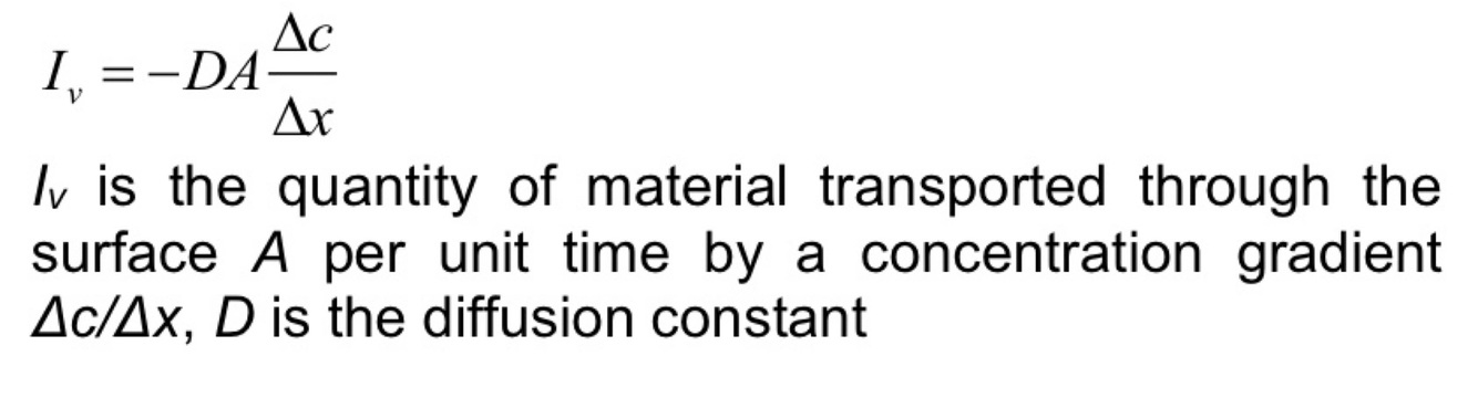 Write Fick’s first law and interpret the constants and physical quantities.