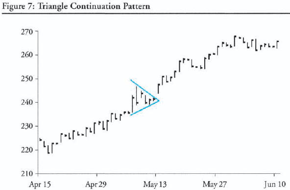 Triangles, rectangles, flags, and pennants are thought to be continuation patterns, which indicate that the trend in which they appear is likely to go further in the same direction.