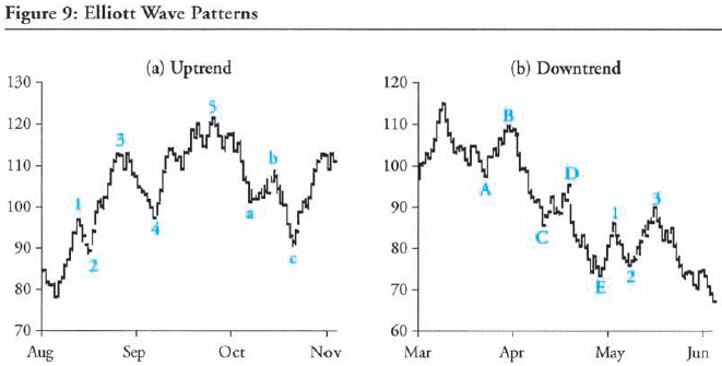 Elliott wave theory suggests that prices exhibit a pattern of five waves in the direction of a trend and three waves counter to the trend. Technical analysts who employ Elliott wave theory frequently use ratios of the numbers in the Fibonacci sequence to estimate price targets and identify potential support and resistance levels.