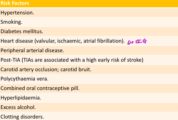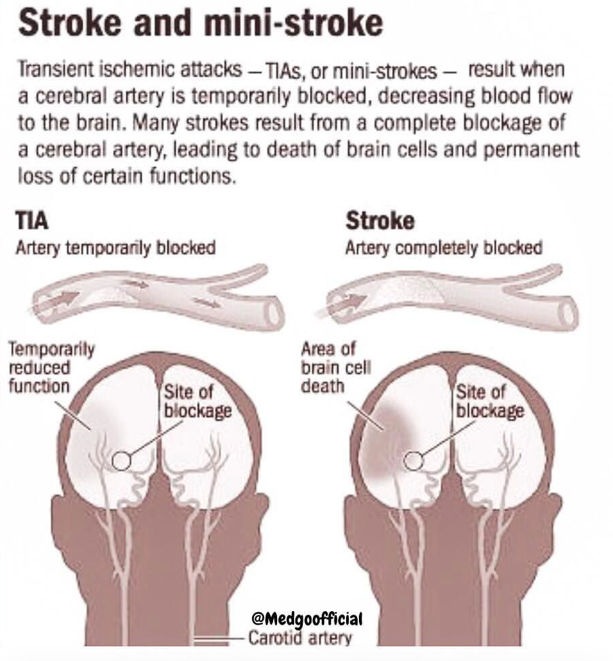 - TIA: have similar clinical features of a stroke but completely resolve within 24 hours as only temporary blockage