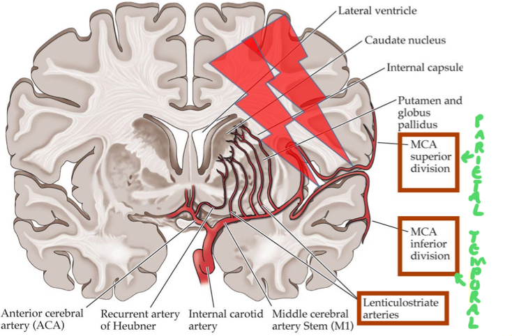 - Contralateral full hemiparesis (face, arm and leg affected as internal capsule affected)
