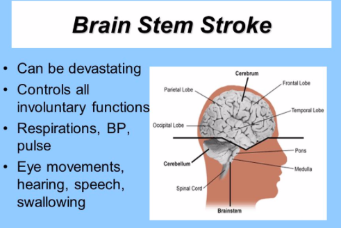 - Stroke: a ‘cerebrovascular accident’, is a ‘serious life threatening condition that occurs when the blood supply to part of the brain is cut off’. The symptoms and signs persist for more than 24 hours and cause an infarction