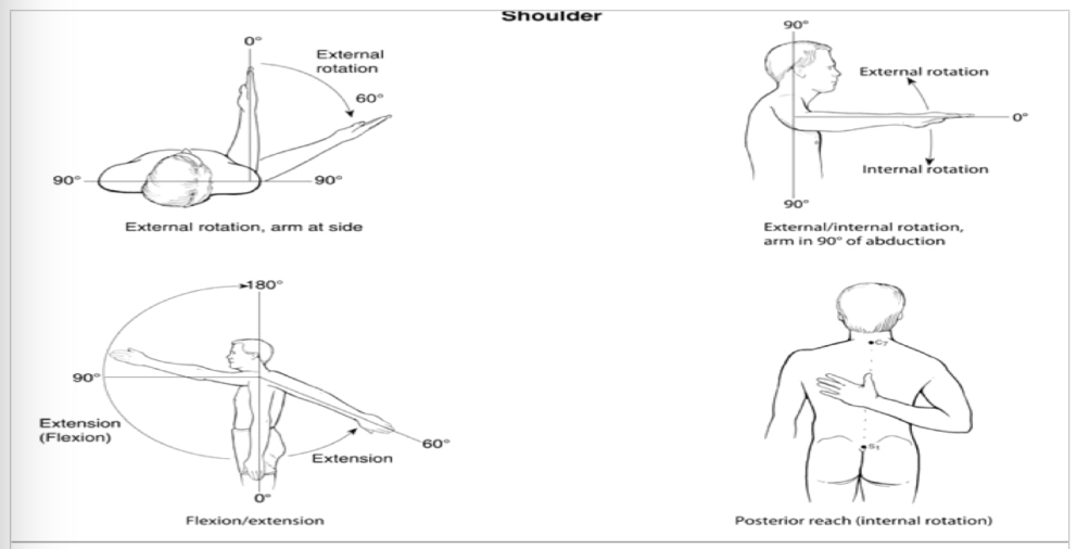 Do the motions for shoulder external rotation, internal rotation, extension, flexion, and posterior reach (internal rotation).