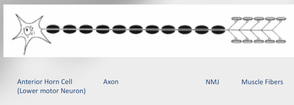 Lower motor neuron (anterior horn cell), axon, NMJ, and muscle fibers.
