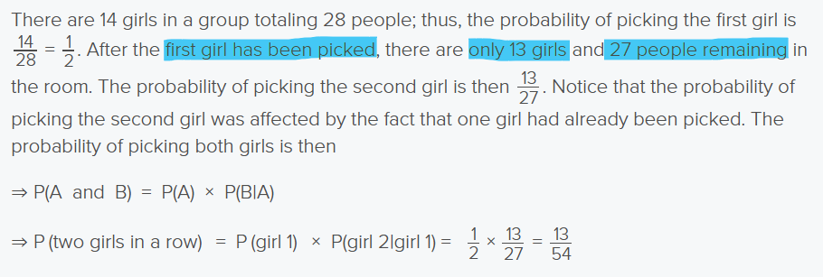 When two events, A and B, are dependent if the occurrence of the first event affects the occurrence of the second event in such a way that the probability of the second event is changed