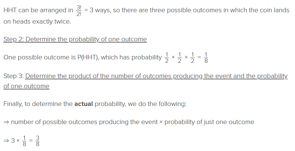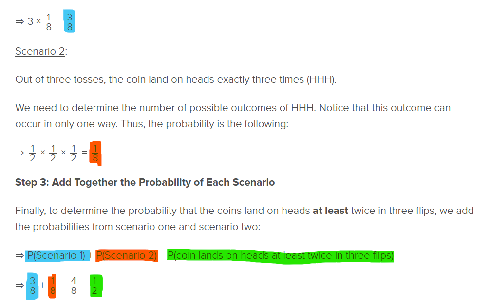 “a fair coin is tossed 3 times. What is the probability that it lands on heads AT LEAST two times?”