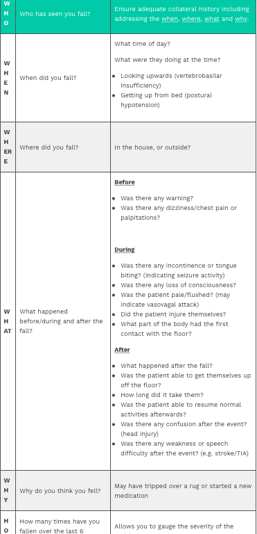 If a patient has a fall you need to do a falls risk assessment, what are some components involved in this?