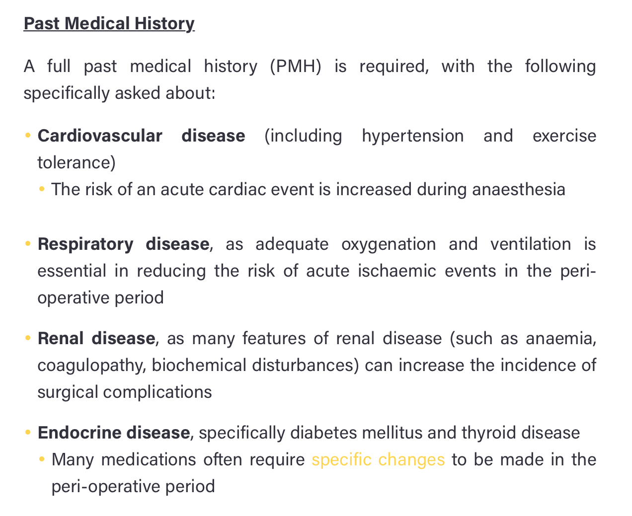 Done a few weeks before surgery to identify any co-morbidities than may lead to complications during anaesthetic, surgery or the post-operative period