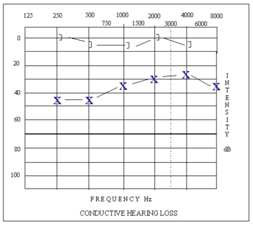 [The above figure represents conductive hearing loss, where bone conduction is better than air conduction. This is due to the fact that intensity needed for bone conduction is lower than the intensity needed for air conduction. Intensity is represented by the vertical line and frequency the horizontal line. The only choice where a pathology would cause conductive hearing loss is a]