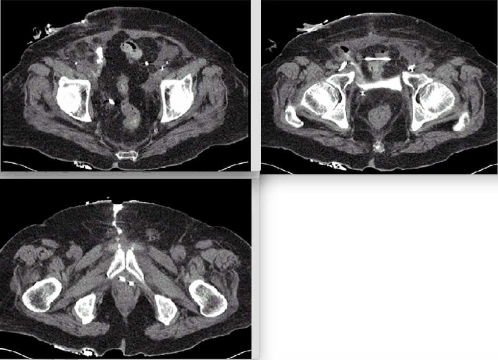 A delayed urinary leak following urinary reconstruction should lead the clinician to suspect tissue ischemia/necrosis. In these cases, the leak is unlikely to resolve with observation alone. Fascial repair is unnecessary unless signs of dehiscence are present. Maximal drainage of the reconstructed segment is essential in order to minimize the output of the leak. In this case, the CT image demonstrates leakage from the proximal end of the conduit. Given the presence of stomal retraction, catheter drainage of the conduit may decompress the leak. Given the pooling of contrast in the pelvis, a percutaneous drain is also advisable in order to control the fistula, minimize the risk of local abscess, and to protect the fascia from further dehiscence. While this patient may ultimately require stomal revision, it would not be advisable until determining if the leak will heal with conservative therapy. Early exploration and repair is difficult given the intense local inflammatory reaction, and it is likely to result in a high risk of treatment failure given the condition of the local tissues.