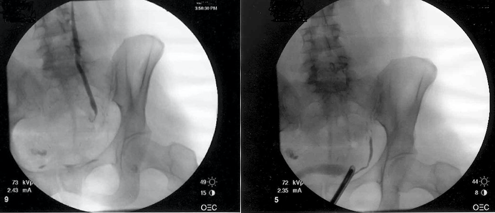 The retrograde and antegrade studies show a complete obstruction of the left distal ureter at the level of the uterine vessels. Most likely, the ureter was divided during clamping of the left uterine vascular pedicle or a thermal injury was sustained. The high grade obstruction (no contrast goes through the obstruction with both retro and antegrade injections) demonstrated makes the success of an endoscopic approach unlikely. Ureteroureterostomy is not a good option in the distal ureter, and should be reserved for short mid- to upper ureteral defects. The best repair for this patient is a ureteral reimplant with a psoas hitch. A Boari flap is not necessary in this patient and is reserved for lengthy distal ureteral defects up to 15 cm long.