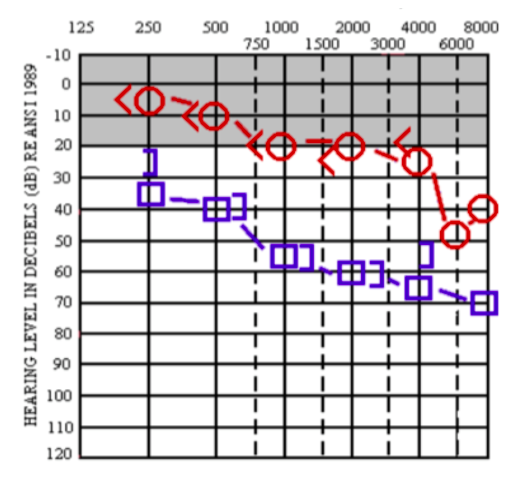 (We did not take audiograms but this is an example of conductive hearing loss where bone conduction is longer than air conduction, but even if you don’t know how to interpret it B, C, and D are all examples of sensorineural hearing loss and are impossible to differentiate through just an audiogram so the most likely answer is A)
