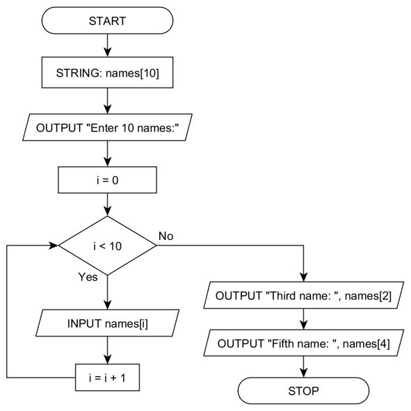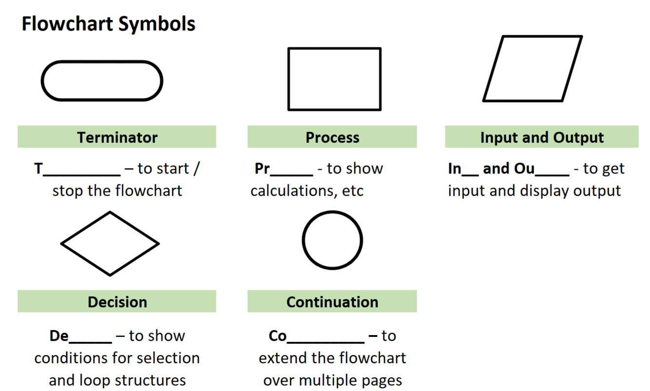 What are the names and shapes of the 5 flowchart symbols you need to know?