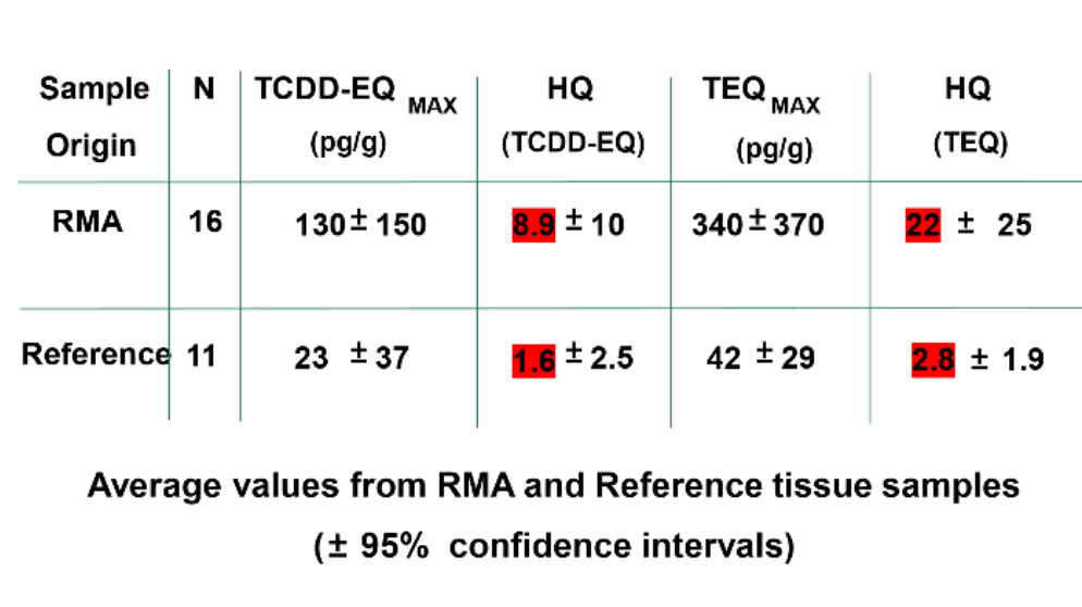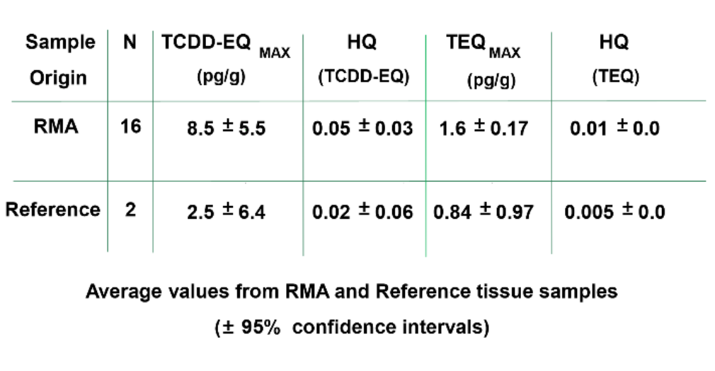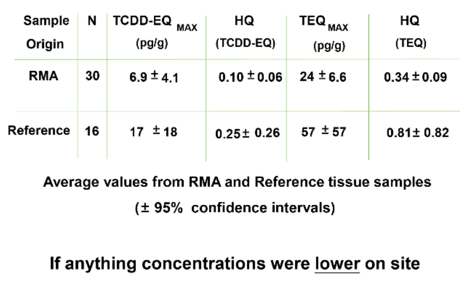 -no statistical differences in concentrations of TCDD-EQ or TEQ were found between reference and RMA locations