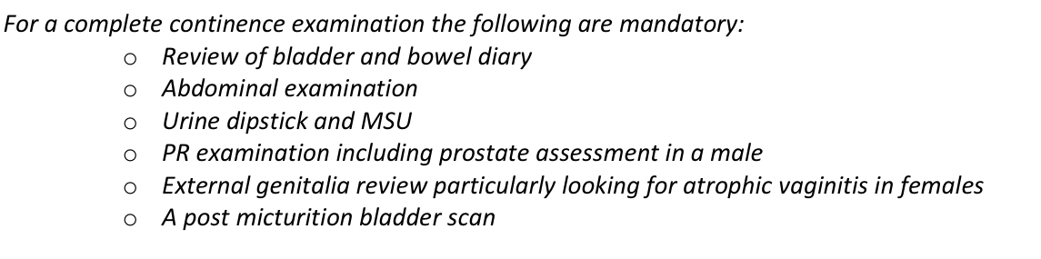 What investigations and examinations should you do for a patient when they present with incontinence?