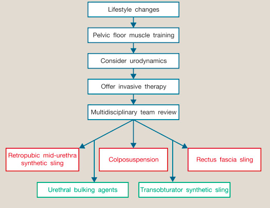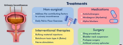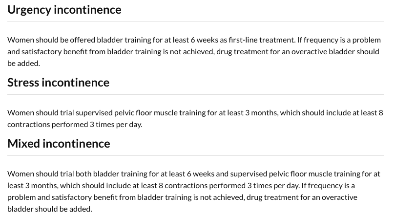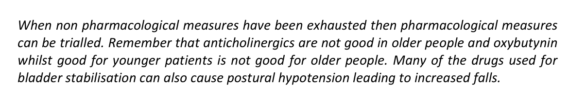 1st Line: switch to decaf drinks, good bowel habit, regular toileting, pelvic floor exercises, bladder retraining
