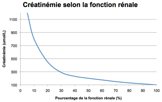 Selon le graphique ci-dessous, une faible variation de la créatininémie près des valeurs normales indique une plus petite diminution de la fonction rénale qu’une petite variation à des valeurs élevées de créatinine.