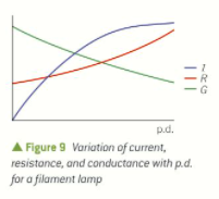 Describe and draw the I-V characteristic of a filament lamp, include pd against resistance and conductance