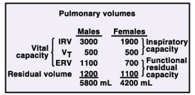 What are the different lung volumes for males and females