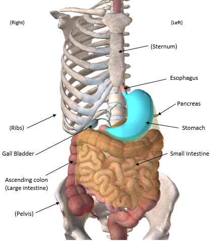 Anterior view of lower alimentary canal in context with accessory organs (pancreas and gall bladder). The stomach is highlighted in blue.