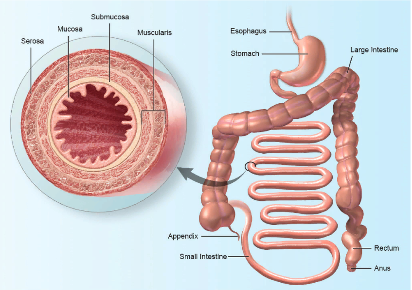 Alimentary canal from the esophagus to the anus, with cross section view of the layers found in the alimentary canal