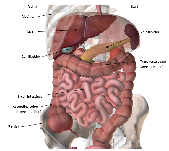 Anterior view of the accessory organs: Liver, pancreas, and gall bladder. The stomach is removed to view the pancreas (which lies posterior to the stomach).