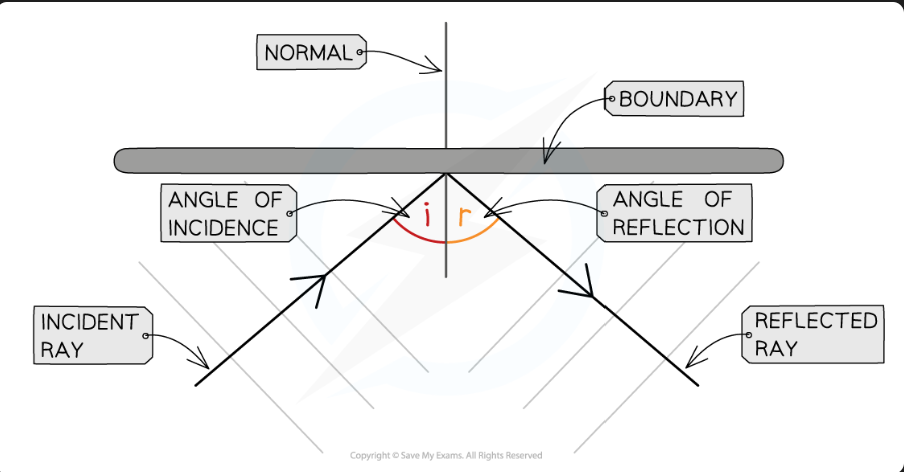 The angles of incidence and reflection are usually labelled i and r respectively