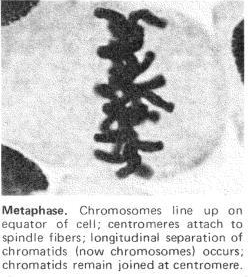 • Metaphase - (Middle - chromosomes lined up along middle of cell)