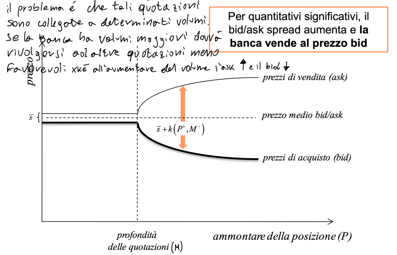 La banca osserva il miglior Bid e il miglior Ask disponibili nel mercato. Il problema è che tali quotazioni sono collegate a determinati volumi. Se la banca ha volumi maggiori dovrà ruvolgersi ad altre quotazioni meno favorevoli perché all’aumentare del volume l’ask sale e il bid scende.