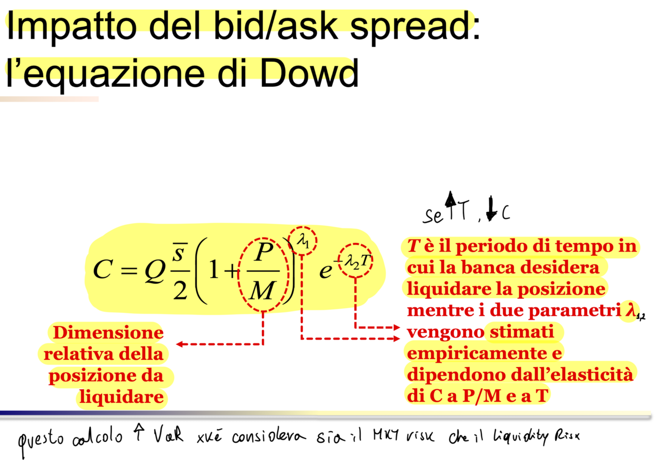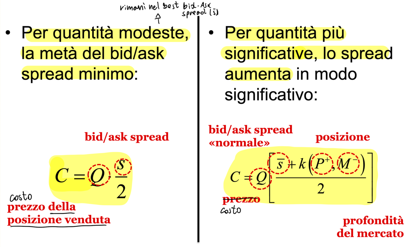 Per le quantità significative, aumenta non solo in base allo spread medio (s segnato) ma è anche funzione positiva dell’aumentare della grandezza della posizione (P) e funzione negativa della profondità delle quotazioni (M)