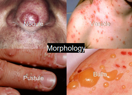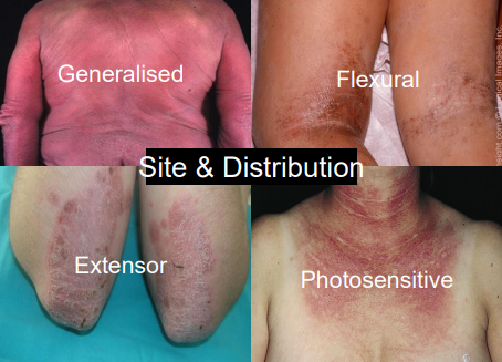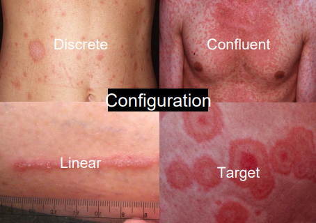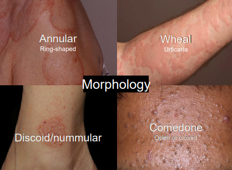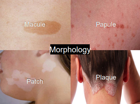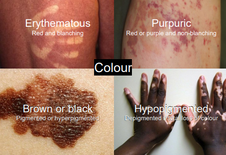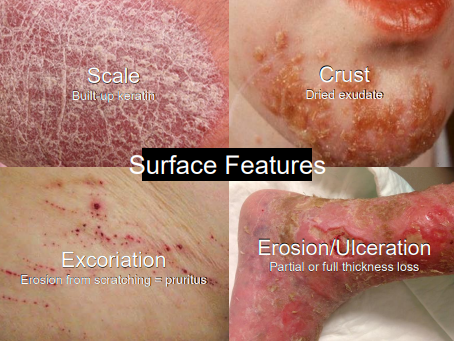 Erythematous- red and blanching (be careful saying dark skin is erythematous, use hyperpigmented instead)